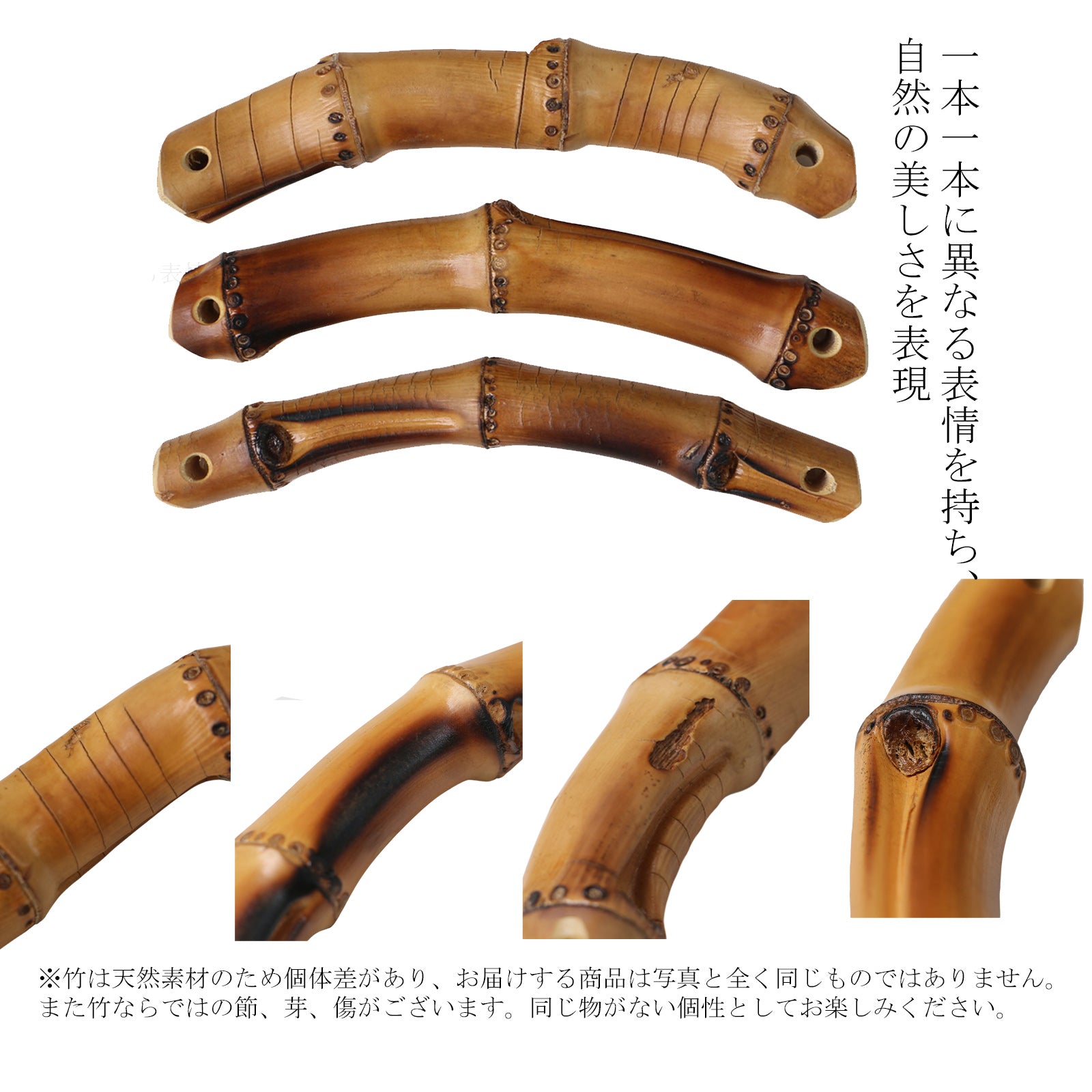 京都産の希少な根竹(根っこの部分)のみを使用し、竹垣・丸竹加工の職人(伝統工芸士)が作った15個限定の「京銘竹ハンドル」。 軽量でありながら、高い強度を持つ竹は使い込めば込むほど色艶が増し経年変化を楽しめます。 また自然の竹ならではの節、芽、傷など同じものが2つとない「唯一無二」の個性が最大の魅力です。 根っこの採取から塗装仕上げまで全10工程の時間と手間を掛けて熟練職人がお作りした贅沢な一品。 「日本の伝統産業である竹の魅力を身近なもので伝えたい」そんな思いがこめられたハンドルです。 ※竹は天然素材のため個体差があり、お届けする商品は写真と全く同じものではありません。また竹ならではの節、芽、傷がございます。同じ物がない個性としてお楽しみください。